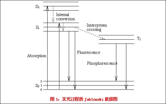 OLED是基于有机材料的一种电流型半导体发光器件。其典型结构是在ITO玻璃上制作一层几十纳米厚的有机发光材料作发光层,发光层上方有一层低功函数的金属电极。当电极上加有电压时,发光层就产生光辐射。和无机薄膜电致发光器件(TFEL)不同,有机材料的电致发光属于注入式的复合发光,其发光机理是由正极和负极产生的空穴和电子在发光材料中复合成激子,激子的能量转移到发光分子,使发光分子中的电子被激发到激发态,而激发态是一个不稳定的状态,去激过程产生可见光。为增强电子和空穴的注入和传输能力,通常又在ITO和发光层间增加一层有机空穴传输材料或/和在发光层与金属电极之间增加一层电子传输层,以提高发光效率。发光过程的Jablonski能级图如图 1所示: